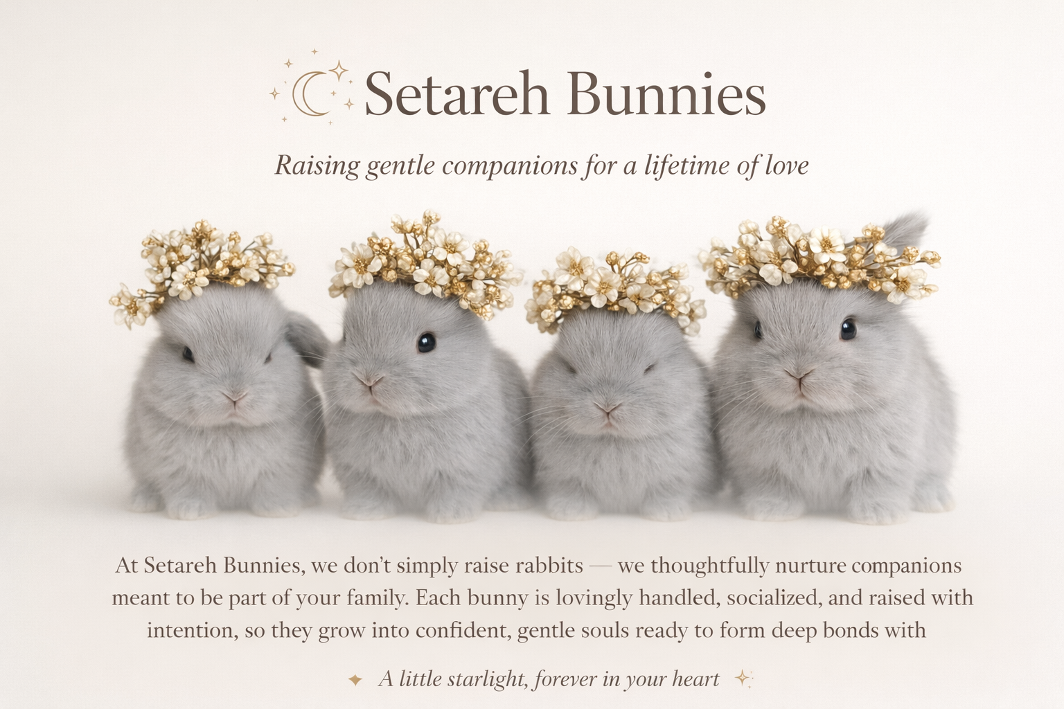 Next baby Bunnies Trixie anticipated: End of February 2026 Poppy anticipated: End of March 2026 Waiting List Started Visit our Waiting List Page to find out how to get on it! ![]() ![]() 🌙 Mission Statement Our Mission At Setareh Bunnies, our mission is to thoughtfully raise gentle, confident companion rabbits through intentional care, early socialization, and a welfare-first approach. We are dedicated to creating lifelong bonds between bunnies and their families — nurturing not just healthy bodies, but secure, trusting hearts — so every Setareh bunny brings comfort, joy, and a little starlight into the lives they touch. ⸻ ✨ Our Values 🐰 Welfare First, Always The physical and emotional well-being of our rabbits comes before everything else. From housing and nutrition to handling and enrichment, every decision is made with the bunny’s best interest at heart. 🌱 Intentional Beginnings We believe early life matters. Our bunnies are raised with hands-on care, gentle exposure, and thoughtful routines designed to build confidence, resilience, and trust from the very start. 🤍 Gentle Companionship Rabbits are sensitive, intelligent beings. We raise companions — not commodities — prioritizing calm temperaments, emotional security, and strong human bonds. 🌙 Education & Transparency We are committed to educating families through honest communication, ongoing support, and resources like our Starlit Start program. Informed homes create thriving rabbits. ✨ Lifelong Connection Our goal is not just placement, but partnership. We strive to create meaningful, lasting matches that honor both the bunny and the family welcoming them home. ![]() Ethically Raised Holland Lops Raised with space, softness, and intention At Setareh Bunnies, our rabbits are raised the way we believe they should live — in a calm, home environment that prioritizes welfare, enrichment, and emotional wellbeing from day one. We do not use traditional cages. Our rabbits are raised in exercise pens, with room to stretch, hop, flop, and explore, because movement and comfort matter. Every bunny is handled daily, socialized thoughtfully, and raised with their future family in mind — not production quotas. ⸻ What Makes Setareh Bunnies Different At Setareh Bunnies, we choose practices that put the rabbit first — even when they’re not the industry norm. • Raised in exercise pens, not cages, allowing room to stretch, hop, and explore • Daily gentle handling and socialization in a real home environment • Welfare-first, education-driven breeding practices • Clean, enriched setups designed for physical and emotional wellbeing • 1 Year Genetic Health Guarantee**Terms apply • Ongoing support and learning resources for new owners • Registered member of the American Rabbit Breeders Association (ARBA) and the Holland Lop Rabbit Specialty Club (HLRSC), reflecting our commitment to breed education and ethical standards ARBA and HLRSC. membership is uncommon among rabbit breeders in Utah, and we’re proud to uphold standards that go beyond the minimum — not because it’s required, but because it’s right. ⸻ ![]() Raised for Life as a Companion Our goal isn’t just to raise beautiful rabbits — it’s to raise confident, calm companions. By providing space, enrichment, and consistent human connection, our bunnies develop: • Better confidence in new environments • Lower stress during transitions • Strong foundations for bonding and family life We raise every bunny as if they’re staying — because their start matters. ⸻ Meet Our Herd Our rabbits are part of our home and our family. Each member of our herd is carefully selected, thoughtfully raised, and deeply loved. 🌙 Our Foundation Trio ![]() ✨ Cuddle Buns Venus of Setareh “Poppy” A soft-soul lilac chinchilla doe with a tender, emotionally intuitive temperament. ![]() ✨ Blue Tulip’s Moonlit Mist of Setareh “Rhys” Our upcoming lilac chinchilla buck — calm, fluffy, typey, and beautifully dilute-toned. ![]() ✨ Setareh’s Velvet Sadie Stardust “Trixie” A plush blue cream harlequin VM doe with bright curiosity, gentle confidence, and a sparkling, people-oriented personality. Together, these three form the heart of the Setareh breeding program. Our first planned litters begin Spring 2026, focusing on health, temperament, and the signature Setareh look. Expected colors from our trio pairings: 🌸 Lilac chinchilla 🌸 Blue chinchilla 🌸 Lilac 🌸 Blue 🌸 Soft pastel dilute variations 🌸 Calm, cuddly, confident temperaments 🌸 Round faces, clean crowns, plush coats, soft shading ![]() ⸻ ![]() Education & Support Matter Here We believe ethical breeding includes education. New and future bunny owners have access to learning resources covering: • What to know before getting a rabbit • Proper housing and setup • Diet and digestive health • GI stasis awareness • Grooming, litter habits, play, and training Because informed owners create safer, happier homes. Visit our Learning Resources Page ⸻ ![]() Our Commitment We are committed to: • Ethical, welfare-first breeding • Transparent practices • Thoughtful placements • Ongoing education and support Setareh Bunnies exists to raise rabbits with care, intention, and respect — always. ⸻ ![]() Ready to Welcome a Little Star? If our philosophy resonates with you, we’d love to connect. → Join the Waitlist → View Adoption Guidelines → Contact Us ⸻ 🌙 Let’s Connect We’d love to talk rabbits, colors, care, or future litters. Call/Text: 385-414-5938 Instagram: @Setarehbunnies Website updates coming soon ✨ Proud Members: All Bunnies Current on: |