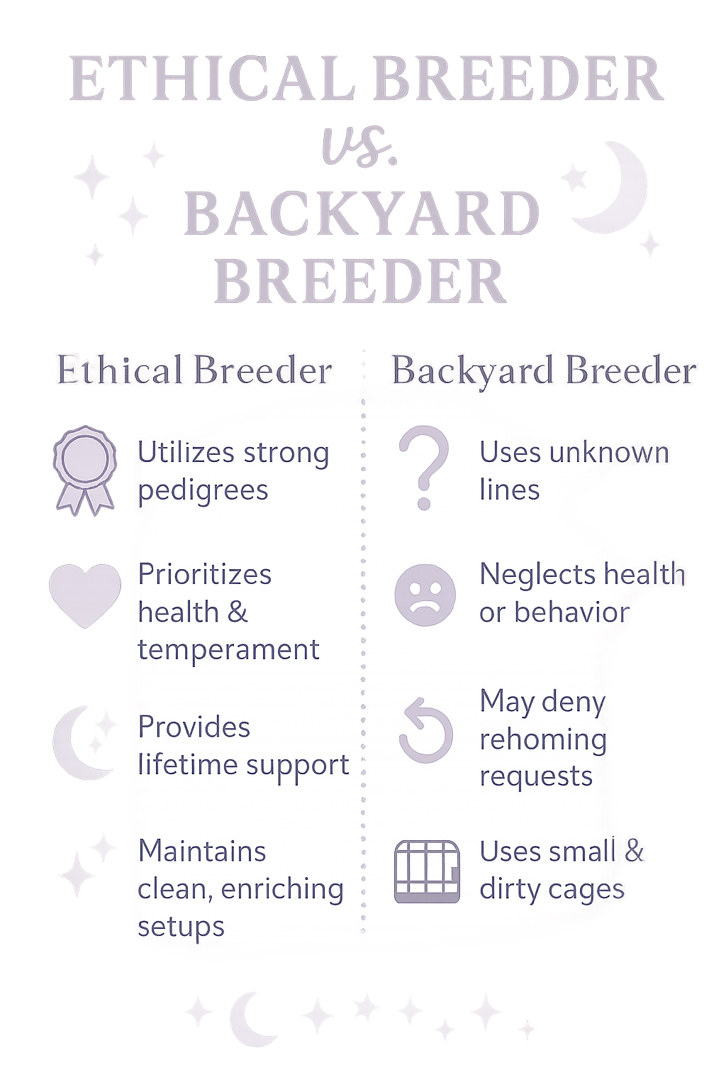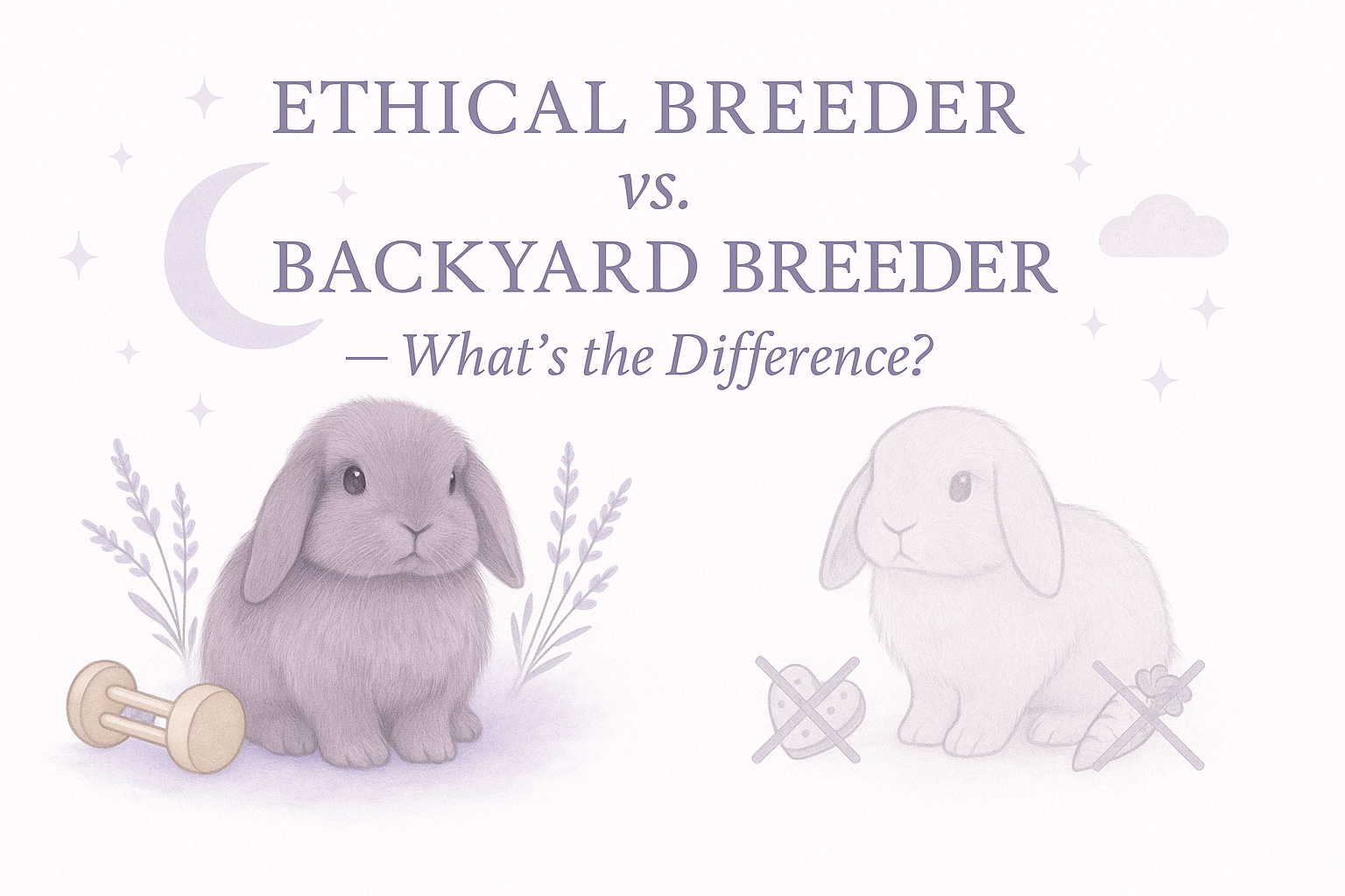 ![]() Ethical Breeder vs Backyard Breeder Why it matters for you — and for the bunnies. Choosing where your bunny comes from is just as important as choosing which bunny comes home with you. This page is here to gently walk you through the difference between an ethical breeder and a backyard breeder, and to show you where Setareh Bunnies fits in that picture. ⸻ What is an Ethical Breeder? An ethical breeder’s first priority is health, temperament, and welfare, not “how many babies can I sell.” Ethical breeders typically: • ✅ Focus on a few select breeds/lines They know their lines, colors, and pedigrees and are always working to improve them. • ✅ Health- and temperament-test through screening & vet care Regular vet checks, appropriate treatments, and careful monitoring of moms, dads, and babies. • ✅ Limit litters Does are given rest between litters, and not bred too young, too old, or too often. • ✅ Keep clean, enriched housing Fresh hay, clean water, safe flooring, enrichment toys, and enough space to move and stretch. • ✅ Handle babies early & kindly Kits are socialized so they grow into confident, people-friendly bunnies. • ✅ Have a waitlist or interview process They care where their bunnies go and want to know about your setup and experience. • ✅ Use clear adoption guidelines & contracts You’ll see expectations for both sides, including return policies if something doesn’t work out. • ✅ Offer support after adoption They’re happy to answer questions and help you through your bunny’s whole life. ⸻ What is a Backyard Breeder? “Backyard breeder” is a broad term, but generally means someone breeding without the knowledge, support, or intention to prioritize health and welfare. Common backyard breeder red flags: • ⚠️ Many litters available all the time Always-someone-pregnant vibes, no breaks, no talk of recovery or long-term health. • ⚠️ No questions for you If money is taken with no interest in where the bunny goes, that’s a concern. • ⚠️ Little or no information on parents No photos, no ages, no mention of temperament, health, or lines. • ⚠️ Unsanitary or cramped housing Strong smells, stacked cages, wire-only floors, no enrichment or mental stimulation. • ⚠️ Babies rehomed too young Wanting babies gone before 8+ weeks “to make room” for the next litter. • ⚠️ No education offered No care info, no diet guidance, and comments like “they’re just rabbits, they’ll be fine.” • ⚠️ No support after the sale Once the bunny leaves, communication ends. Backyard breeders aren’t always intentionally “bad,” but the result is often the same: bunnies and adopters don’t get the care, support, or stability they deserve. ![]() How to Tell the Difference (Questions You Can Ask) When you’re talking to any breeder (including me!), here are gentle, fair questions you can ask: 1. How often do you breed your does? 2. How old are the parents and how long have you had them? 3. What is your usual “go-home” age for babies? 4. What are your bunnies fed, and what do you recommend after adoption? 5. Can I see photos of your housing/enclosures? 6. What happens if I can’t keep my bunny in the future? 7. Do you offer a care sheet, contract, or any support after adoption? Ethical breeders are usually happy to answer these and will tell you even more than you asked. ⸻ Where Setareh Bunnies Stands 💜 At Setareh Bunnies, the heart of our program is: • 🌙 Small, intentional breeding program We focus on a tiny number of carefully chosen Holland Lops in dilute colors (lilac chinchilla, etc.), not mass production. • 🐰 Health & temperament first We work closely with rabbit-savvy veterinary care when needed and monitor every bunny daily. • 💛 Limited litters & lots of rest Our does are part of our family, not “breeding machines.” They get time off, mental enrichment, and soft lives. • 🌸 Hands-on, gentle socialization Babies are handled with care and respect from appropriate ages so they grow up confident and people-friendly. • 📖 Education & transparency Our website, care guides, and “Dream Bunny Adoption Hub” exist to help you make informed, compassionate decisions. • 🏡 Adopter screening & support We want to know about your setup, lifestyle, and goals so we can help you find the right match — and we’re here for you after adoption, too. We’re not perfect and we’re always learning, but our commitment is simple: soft, ethical, heart-led breeding with the bunny’s welfare at the center. ⸻ Why This Matters Choosing an ethical breeder: • Reduces the risk of hidden health issues • Supports kind, responsible breeding practices • Helps discourage careless or profit-only breeding • Gives you a built-in support person for your bunny’s entire life Whether you adopt from Setareh Bunnies or another program, we truly want you to feel confident, informed, and empowered to choose a breeder who puts care over quantity and welfare over convenience. ⸻ Ready to Start Your Dream Bunny Journey? ✨ Visit our [Dream Bunny Adoption Hub] (link) to learn: • How our adoption process works • Current and upcoming litters • How to join our waitlist Soft hearts, soft ears, soft ethics. That’s the Setareh Bunnies promise. 🐰🌙💜 |