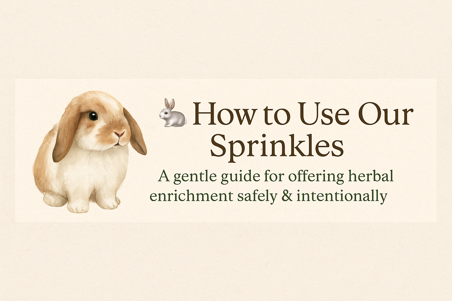 ![]() A gentle guide for offering herbal enrichment safely & intentionally Rabbits are natural foragers — sniffing, exploring, and nibbling through a variety of plants in the wild. Poppy’s Burrow Blends were created to bring that same healthy curiosity into your home in a safe, tiny, bunny-appropriate way. Below you’ll find everything you need to know about when, how, and how much to use each blend. ⸻ 🌱 1. When Can Baby Rabbits Have Sprinkles? Bunnies under 6 months have delicate digestive systems and should stay on a simple, stable diet as they grow. ✔ 12-week-old Poppy (your baby bun!) Safe blends in tiny amounts: • Calm & Forage Sprinkle → SAFE ▸ Give only a literal pinch (⅛ tsp) ▸ No more than 1–2× per week ▸ Ideal for bonding, stress reduction, and gentle enrichment • Comfort Mix (Heart Healthy) → SAFE but wait until 16+ weeks ▸ Contains mildly richer herbs ▸ Best introduced after 4 months old • Belly Blend → OK for 12 weeks, but VERY tiny amounts ▸ Give a pinch only during tummy off-days ▸ Not for routine enrichment at this age • Meadow Herb Mix → SAFE at 12 weeks in tiny amounts ▸ Great starter blend ▸ ⅛ tsp max, 1–2× per week ❌ Avoid for now: • Daily use • More than ⅛ teaspoon • Multiple blends given on the same day • Any blends containing hawthorn (premium version) until 6+ months ⸻ 🌿 2. How Much to Give (All Ages) Baby (8–16 weeks) 🐇 1 pinch (⅛ tsp) 🐇 1–2× weekly 🐇 One blend per day max Teen (4–6 months) 🐇 ¼ tsp 🐇 2–3× weekly Adult (6+ months) 🐇 ¼–½ tsp 🐇 2–4× weekly depending on the blend ⸻ 🌼 3. How to Offer the Sprinkles You can offer the blends in four simple ways: Method 1 — Over Hay (best method) Lightly sprinkle over their hay pile to encourage natural foraging. Method 2 — Mixed Into Greens Add a tiny pinch over their morning salad. Method 3 — Sniff, Explore & Forage Create a tiny “snuffle plate”: • A pinch of herbs • Mixed with hay and safe dried petals • Let them nose through it freely Method 4 — Recovery Support (for Belly Blend only) Offer a pinch in a tiny dish when: • Poppy seems slightly slower • Stress after vet visits • Mild digestive changes • Seasonal shedding slowed her belly ⸻ 🐾 4. How Often to Use Blends Enrichment Blends (Calm & Forage, Meadow) ✔ 1–3× weekly (depending on age) ✔ Best spaced out throughout the week ✔ Not daily Support Blends (Belly Blend, Comfort Mix) ✔ 1× weekly or as needed ✔ Not for daily or continuous use ✔ Great during stress, shedding, or big schedule changes ⸻ 🍃 5. Signs Your Bunny Is Tolerating Blends Well Your rabbit is doing great if you see: ✓ Normal round, dry poops ✓ Normal appetite & activity ✓ No gas, bloating, or soft stool ✓ Curiosity and happy foraging ⸻ ⚠️ 6. When to Pause Herb Blends Stop temporarily if you notice: • Soft stool • Smaller stool size • Loud tummy sounds • Less eating • Lethargy Resume only when stools normalize. ⸻ 🌸 7. Safe Pairing You can use blends with: ✔ Hay ✔ Leafy greens ✔ Limited treats ✔ Recovery formulas (if ever needed) Do not pair with: ✘ Sugary treats ✘ Pellets containing dried fruit ✘ Multiple herb blends in one day ✘ Very high-dose flax or grains in young rabbits ⸻ 💛 Bunny-Safe Philosophy Every sprinkle is created using: 🌿 Whole, food-grade botanicals 🌿 No additives or sugars 🌿 Bunny-safe herbs only 🌿 Gentle, tiny-serving formulas |