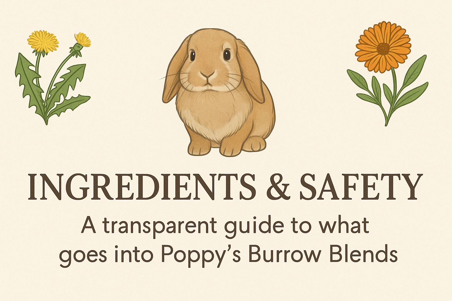A transparent guide to what goes into Poppy’s Burrow Blends** ![]() Every sprinkle and blend created for Poppy’s Burrow is made from gentle, bunny-safe herbs and grains chosen specifically for enrichment, natural variety, and occasional wellness support. This page explains what we use, why we use it, and how to offer herbs safely to rabbits of all ages. ⸻ 🌿 What “Bunny-Safe” Means Not all herbs are safe for rabbits, and not all safe herbs are appropriate for daily use. Our blends follow these principles: ✔ No sugars or dried fruit ✔ No seeds (except tiny amounts of flax when noted) ✔ No oils, fillers, or artificial additives ✔ No alfalfa, wheat bran, or concentrated proteins ✔ No high-calcium daily herbs ✔ Always limited-quantity enrichment — not diet replacements Each ingredient is selected for light enrichment, natural scent variety, or gentle digestive comfort. ⸻ 🌸 Ingredients We Use in Our Blends 🍃 Dandelion Leaf A nutrient-rich, bunny-friendly herb used for natural variety and occasional urinary support. Use: Occasional enrichment. 🍃 Lemon Balm A soothing herb that supports relaxation and gentle digestion. Use: Calming blends (not daily). 🍃 Peppermint Leaf Helps freshen the palate and may support gas comfort. Use: Very small amounts only. 🍃 Raspberry Leaf A mild, fibrous leaf with gentle GI-friendly properties. Use: Safe for most bunnies in limited amounts. 🌼 Chamomile Flowers A calming, gentle digestive support herb. Use: Nighttime/calm blends only. 🌼 Calendula Petals Soft, pretty petals known for gut-soothing and anti-inflammatory properties. Use: Safe enrichment petal. 🌺 Rose Petals / Rosehips (crushed) Vitamin C–rich, aromatic, and fiber-friendly. Use: Rosehips only in very small amounts due to natural sugars. 🌺 Hibiscus Petals Rich in antioxidants; adds color and aroma. Use: Tiny amounts only. 🍃 Marshmallow Leaf Known for soothing mucous membranes and supporting hydration. Use: Occasional digestive support. 🍃 Nettle Leaf Mineral-rich and safe in very small amounts. Use: Gentle enrichment only. 🍃 Olive Leaf Natural plant antioxidants. Use: Tiny amounts in wellness blends. 🌾 Rolled Oats A gentle carbohydrate source for picky eaters. Use: Very small quantities only; not daily. 🌾 Barley Flakes / Groats Adds texture; helps with foraging behavior. Use: Occasional grain enrichment only. 🌾 Wheat Germ High-nutrient supplement used in tiny amounts in the Belly Blend. Use: Only for adult rabbits, very sparingly. 🌱 Flax Seed (Cold-Milled) Supports coat and digestive lubrication. Use: Used only in pinches. ⸻ 🐇 Age Recommendations Baby Rabbits (Under 6 Months) ❌ No grains ❌ No seeds ❌ No rosehips or sugary botanicals ✔ Very tiny amounts of leaf-only herbs, introduced one at a time ✔ Must be offered very rarely (once every 1–2 weeks) Poppy can enjoy tiny leaf/herb sprinkles, but blends with oats, flax, or wheat germ should wait until 6 months. ⸻ 🌿 Safety Guidelines 1. Herbs Are Not Treats They are enrichment — a way to provide natural variety, scent, and mental stimulation. 2. Less Is Always More Rabbits have very sensitive digestive systems. We always recommend tiny pinches, not spoonfuls. 3. Monitor Poops & Appetite If stool softens, becomes smaller, or bunny shows bloating: ➡ stop herbs immediately ➡ return to unlimited hay ➡ contact your rabbit-savvy vet 4. Introduce Slowly Offer one new herb blend at a time and wait 48 hours before trying another. 5. Not a Replacement for Hay These mixes are only for enrichment — hay should always remain 80–90% of the diet. ⸻ ✨ Why We Make These Blends Because rabbits thrive on natural foraging, gentle variety, and beautiful, aromatic enrichment — and we want to help you give them safe experiences without the risks of sugary store-bought treats. Every batch is blended by hand in micro-sizes to ensure freshness and quality. Every ingredient is chosen with Poppy — and your bunny — in mind. |