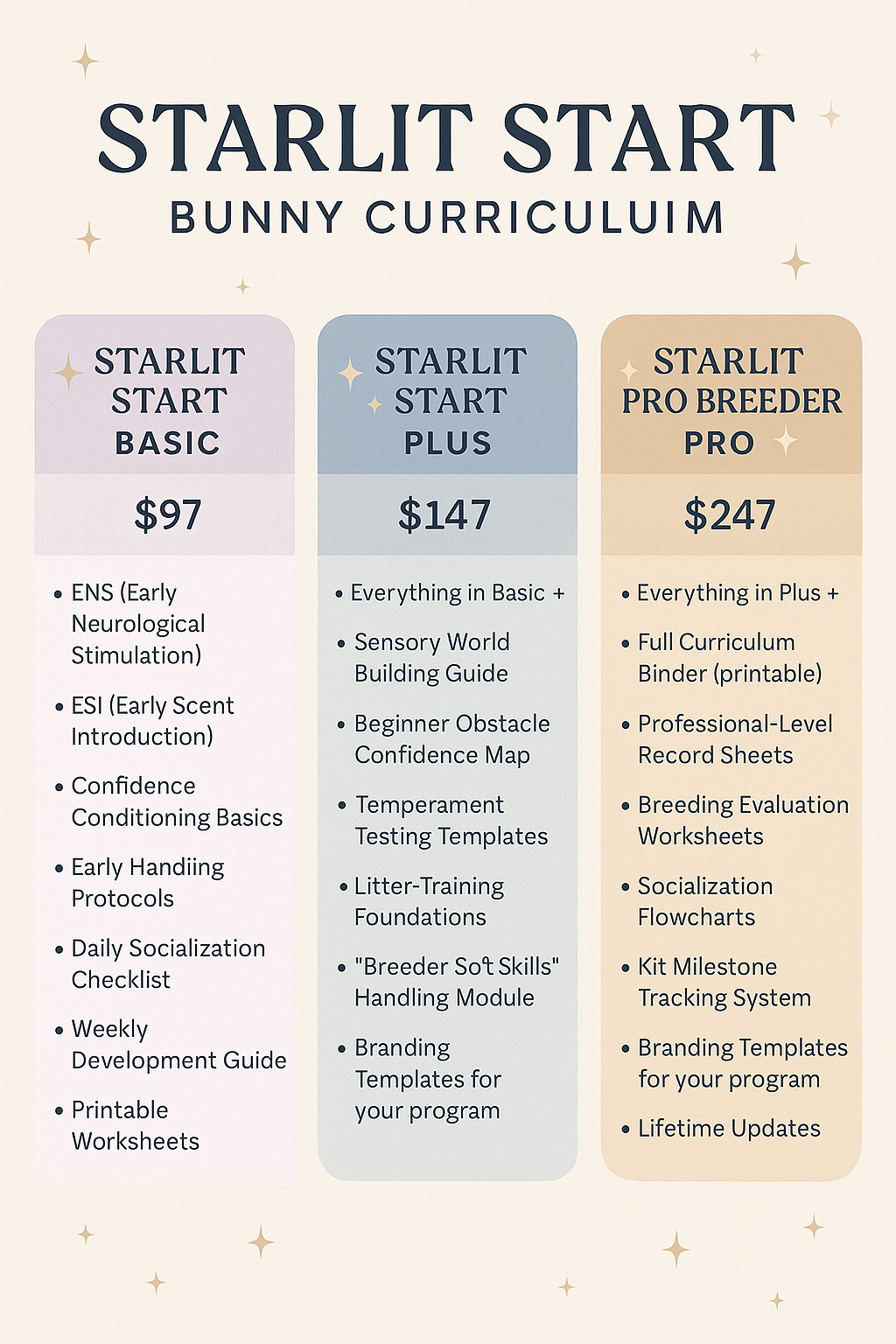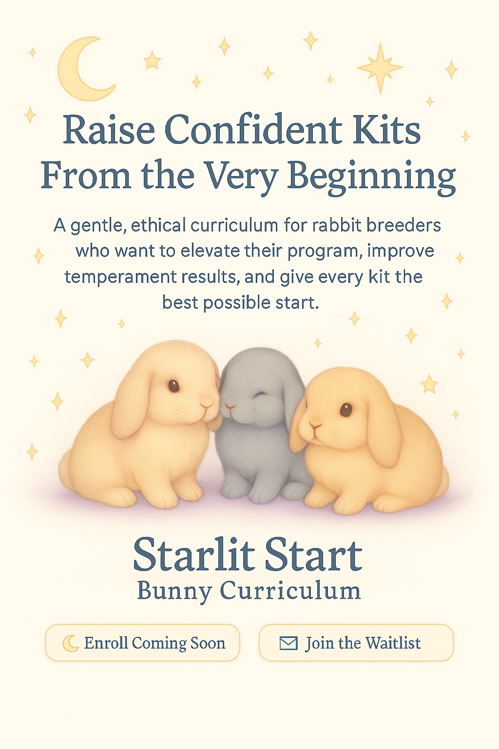 Helping ethical breeders raise confident, calm, well-socialized kits from day one. ![]() ![]() A gentle, ethical, research-supported curriculum for rabbit breeders who want to elevate their program, improve temperament results, and give every kit the best possible start. 🌙 Enroll Coming Soon follow us on Instagram @setarehbunnies for Launch Updates! 📩 Join the Waitlist ⭐ Section 1 — What Is Starlit Start? A soft, celestial curriculum designed exclusively for rabbit breeders. Starlit Start blends early neurological concepts, sensory exposure, ethical handling techniques, and confidence-conditioning for prey animals — all adapted safely, gently, and appropriately for baby rabbits. Developed by Heather at Setareh Bunnies, Starlit Start is rooted in real behavior science, breeder experience, and a deep desire to raise calmer, healthier, more resilient domestic rabbits. A gentle beginning creates a confident life. 🌙 Section 2 — Why Early Handling Matters Rabbits are prey animals — naturally cautious, easily startled, and sensitive to new experiences. The way a kit is handled in the first weeks of life can shape: – Temperament – Confidence & resilience – Ease of bonding – Comfort with grooming & vet care – Adaptability in their future home Starlit Start gives breeders clear, safe, science-backed steps that build trust without overwhelming or overstimulating kits. Trust isn’t forced — it’s nurtured. ✨ Section 3 — What’s Inside the Curriculum A complete, structured system you can easily integrate into your current breeding program: ⭐ The 10 Moments of Trust 10 gentle, daily micro-moments that shape lifelong confidence. Each moment is illustrated, explained, and demonstrated step-by-step. 🌟 Early Sensory Experiences Safe scent introduction, texture exploration, early movement confidence, and novelty exposure. 🌕 Confidence Conditioning Mini-exercises that help young kits become more adaptable, resilient, and secure. ⭐ Breeder Templates & Worksheets Daily logs, temperament observations, litter tracking, socialization records, and a printable binder. 🌙 Educational Videos (Coming Soon) Demonstrating each step with real kits. Everything you need, all in one gentle system. 🌠 Section 4 — Who This Curriculum Is For Starlit Start is ideal for: ✔ Ethical breeders ✔ Small hobby breeders ✔ Programs focused on temperament, health, and families ✔ Breeders who want a repeatable, professional system ✔ Anyone determined to raise confident, well-adjusted rabbits Better beginnings = better bunnies. 🌙 Section 5 — The Results You Can Expect Breeders who follow Starlit Start typically see: ✨ Kits that accept handling with ease ✨ Lower startle response ✨ Improved grooming/nail care cooperation ✨ Faster settling in new homes ✨ Happier owners & stronger breeder reputation ✨ A calmer, more stable temperament line over time Breeding for beauty AND bravery. 🌟 Section 6 — Program Tiers ⭐ Starlit Start Basic — $97 Foundational tools for a gentle start. Includes ENS-adapted handling, early sensory steps, and breeder worksheets. 🌙 Starlit Start Plus — $147 Everything in Basic + confidence maps, temperament templates, and litter training foundations. 🌕 Starlit Start Pro Breeder — $247 The full professional system, including printable curriculum binder, socialization flowcharts, milestone tracking, and branding templates. See Curriculum Breakdownn (Click on the image to see it bigger) ![]() 🌌 Section 7 — Why Breeders Love Starlit Start ⭐ “Our kits are noticeably calmer and easier to handle.” ⭐ “Owners rave about how confident their bunny is from day one.” ⭐ “It elevated our program — families noticed the difference immediately.” Your reputation shines when your bunnies shine. 🌙 Section 8 — FAQ Is this safe for newborn rabbits? Yes — every step is designed with prey-animal sensitivity and developmental stages in mind. Does this replace regular handling? No — it enhances it, giving you structure and purpose behind every interaction. Can I start mid-litter? Yes! You can begin from Day 1 or integrate steps at any stage. Will this help me stand out as a breeder? Absolutely. Few programs emphasize temperament development — Starlit Start becomes a signature of professionalism. 🌙 Join the Waitlist 📘 Get Launch Updates follow us on instagram @setarehbunnies 💌 Notify Me When Enrollment Opens Confidence begins with you — and begins today. |
